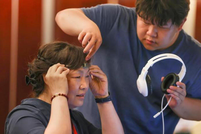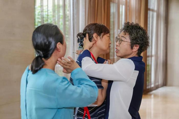 ▲7月11日,在全总国际交流中心举办的健康讲座结束后,自学过中医理疗的全国劳模李香花(右一)给另外两名全国劳模讲解按摩知识。