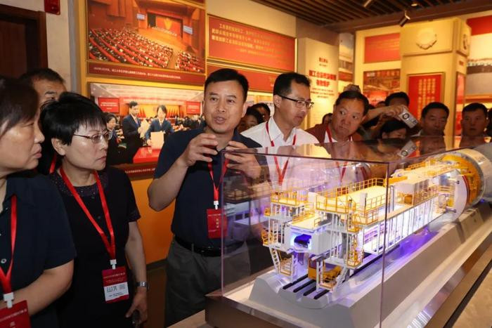 ▲7月8日,在中国工人运动历史和发展成就展国产盾构机展品前,全国劳模葛小青(前排左三)为大家介绍盾构机国产化带来的巨大经济效益。葛小青所在企业是盾构机国内厂商之一。