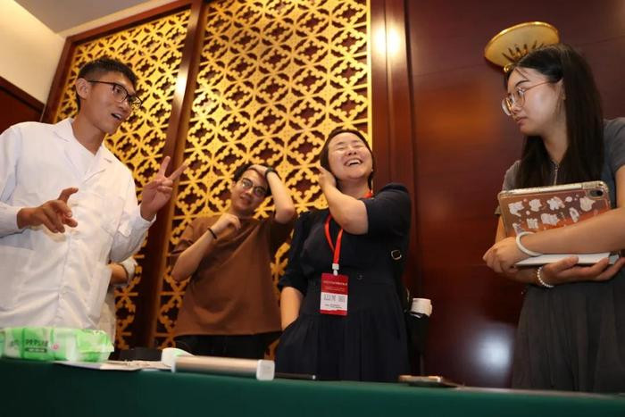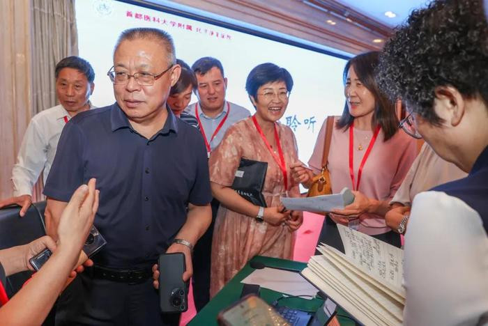 ▲7月11日,首都医科大学附属北京康复医院院长盖海山(左二)在全总国际交流中心开设健康主题讲座。讲座结束后,盖海山继续为劳模工匠们答疑解惑。